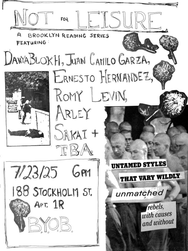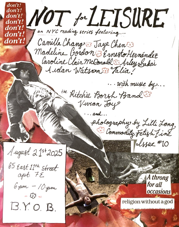 Past readers include: Danya Block, Juan Camillo Garza, Camille Chang, Jaye Chen, Madeline Gordon, Ernesto Hernandez, Romy Levin, Caroline Clair McDonald, Arley Sakai, Maria Sobrino, Talia